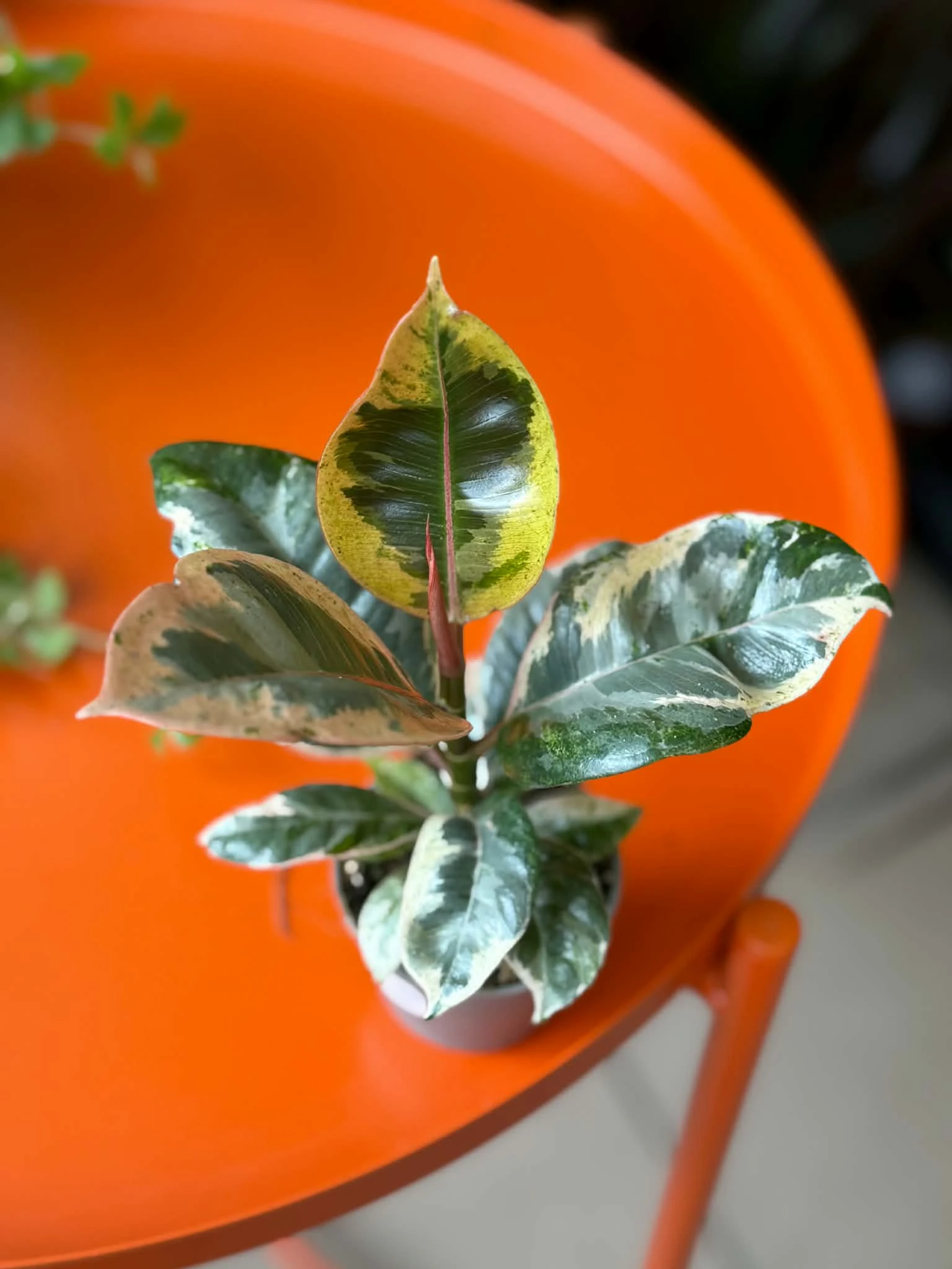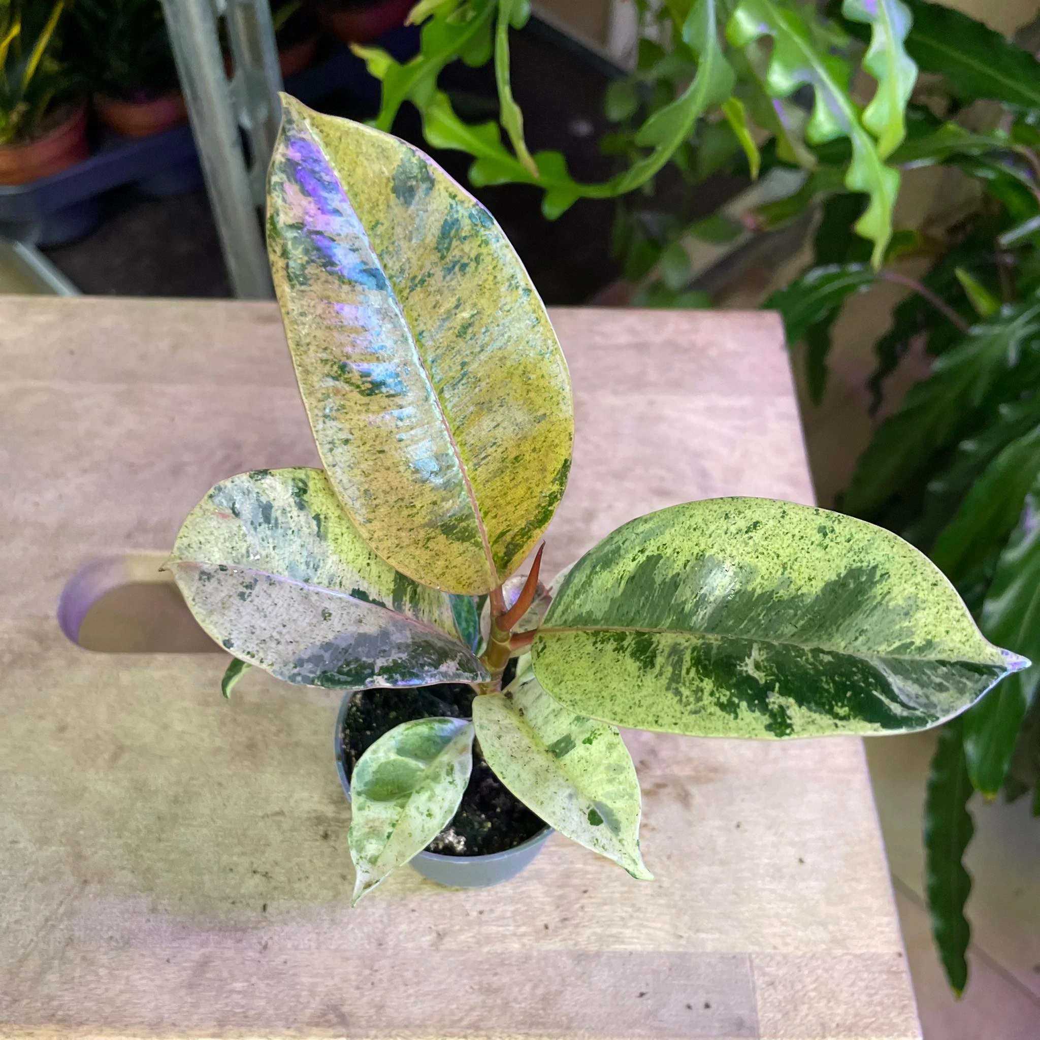 Ficus elastica 'Shivereana' (Moonshine) to wyjątkowy figowiec o marmurkowych, jasnych liściach.