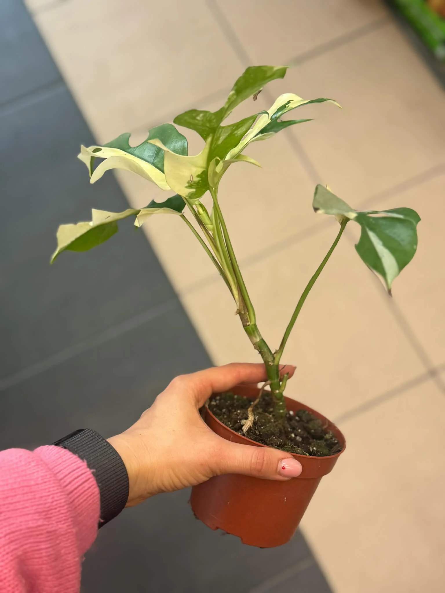 Jej liście przypominają miniaturową monsterę, ale w wersji jasno nakrapianej, marblowanej lub z dużymi sektorami variegacji — biel, krem i jasna zieleń tworzą unikatowe wzory, a każdy nowy liść może zaskoczyć innym układem kolorów.